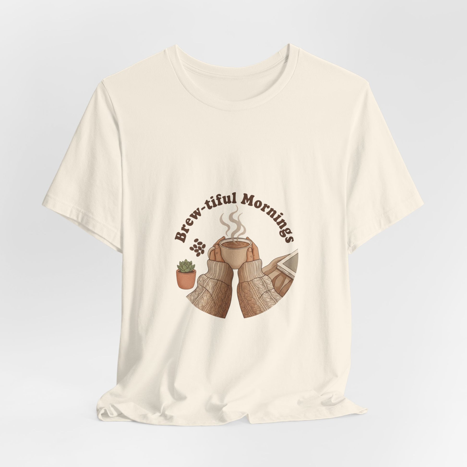 Warm, minimalist coffee imagery in a retro-leaning palette — a trio of textured takeout cups and a steaming mug framed by soft browns and cream tones with the subtle phrase ‘Brew-tiful Mornings.’ The art reads like a cozy barista sketch: clean lines, gentle shading, and friendly retro type that fits the caffeine-coded aesthetic. Lightweight everyday tee designed to layer into slow-morning rituals and casual workdays, bringing a grounded, aromatic vibe to daily wear.