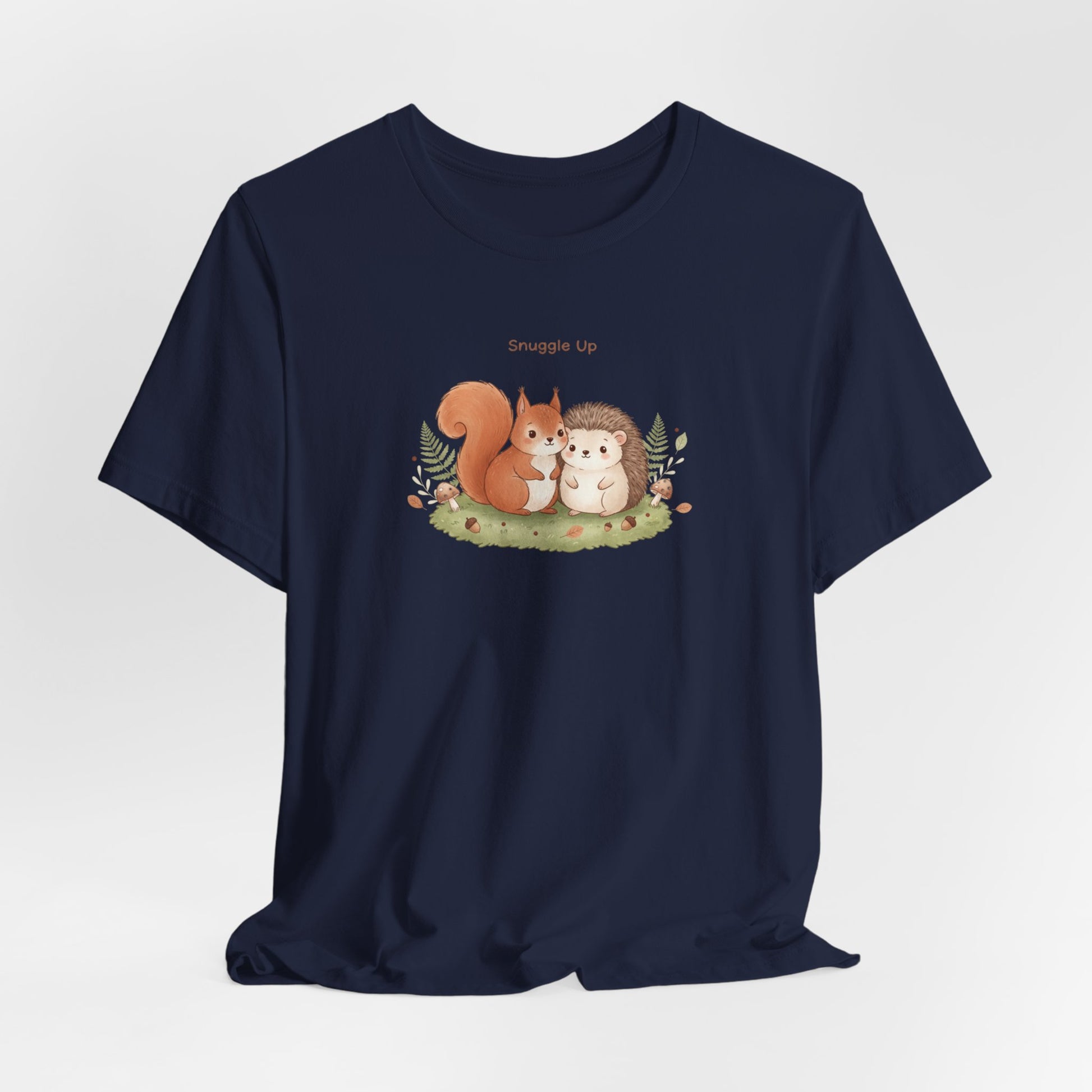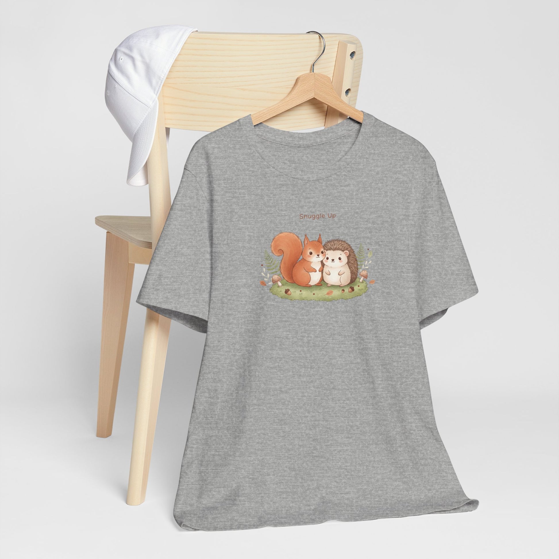 Wholesome winter-forest illustration of two cuddly critters—an auburn squirrel and a soft brown hedgehog—sitting close on a mossy patch framed by tiny leaves and gentle earth tones. The artwork leans into the Cute Cozy Critter Art trend with warm rusts, cream highlights, and a slow-living, comforting mood that reads quietly on apparel. Printed small on a lightweight, breathable tee, the design keeps the look casual and approachable for everyday wear during cooler seasons or layered under sweaters.