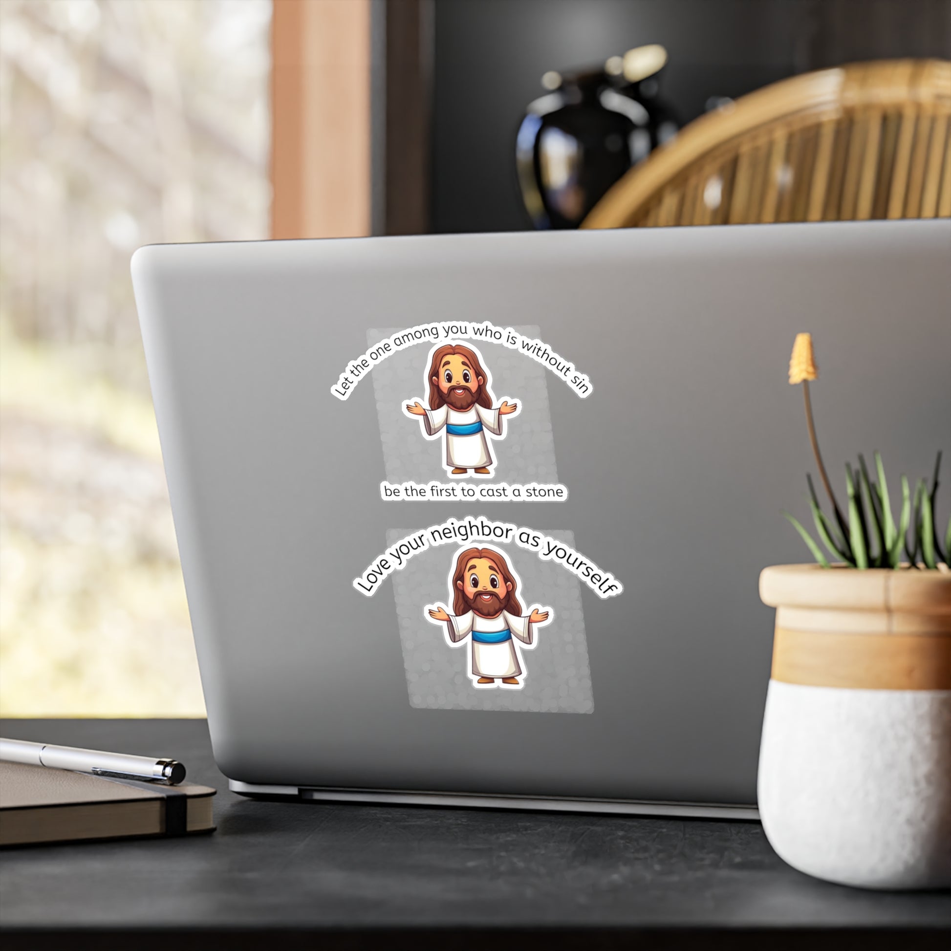 Sweet, simple vinyl decals that carry a gentle message. These kiss-cut stickers show a warm, smiling Jesus character paired with curved text banners reading short reminders — gentle challenges like “Let the one among you who is without sin…” and “Love your neighbor as yourself.” They sit on a satin white vinyl with a thin 1/8" white kiss-cut border, printed in vibrant color that resists water, scratches, and UV fading for up to three years. Place them on a water bottle, laptop, church window, or a journal to add a thoughtful, quietly hopeful touch to everyday surfaces. The removable adhesive peels away cleanly when you decide to move them, and multiple sizes let you choose a subtle accent or a more visible reminder.