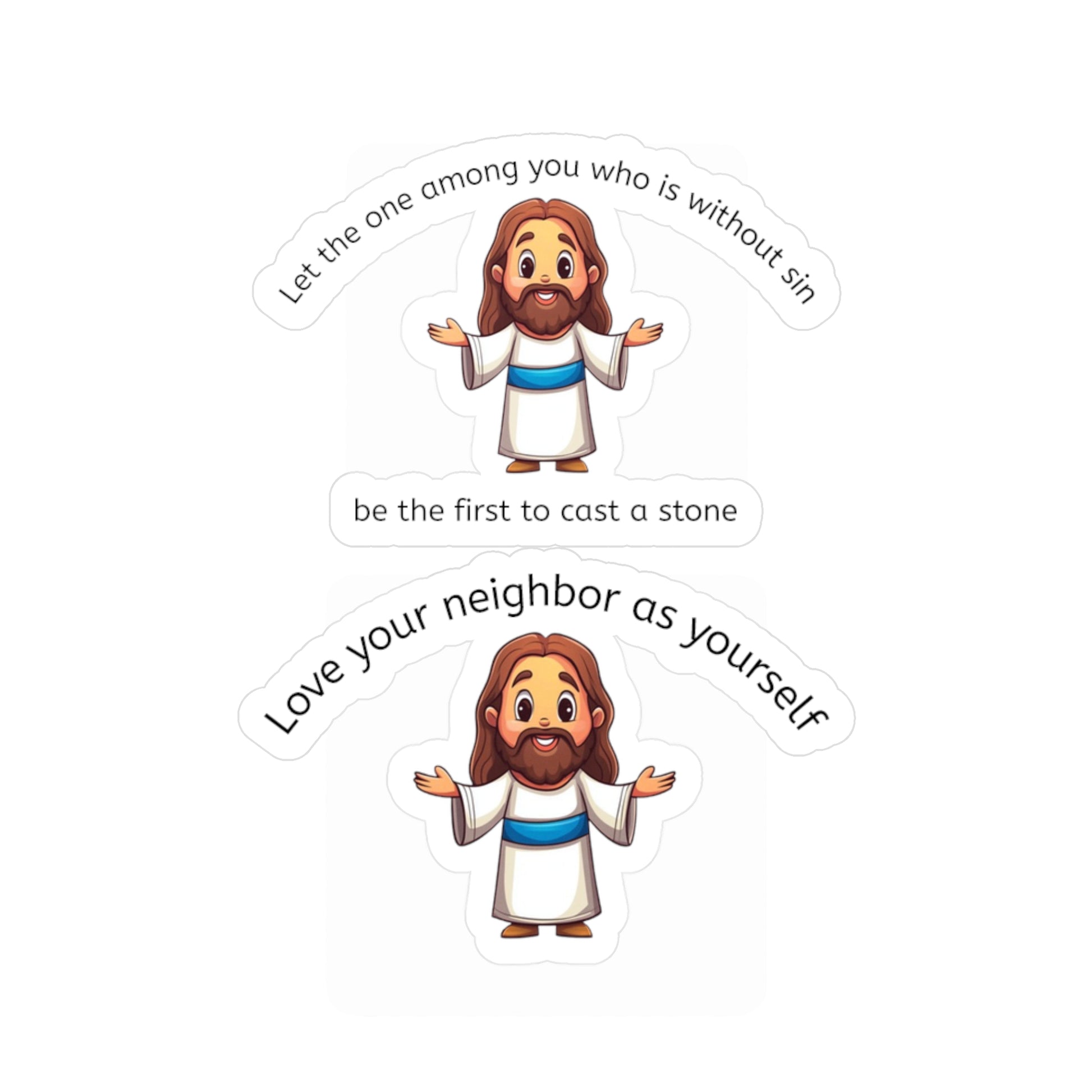 Jesus Cartoon Sticker Set — “Let the one among you who is without sin be the first to cast a stone” & “Love your neighbor as yourself” [...]