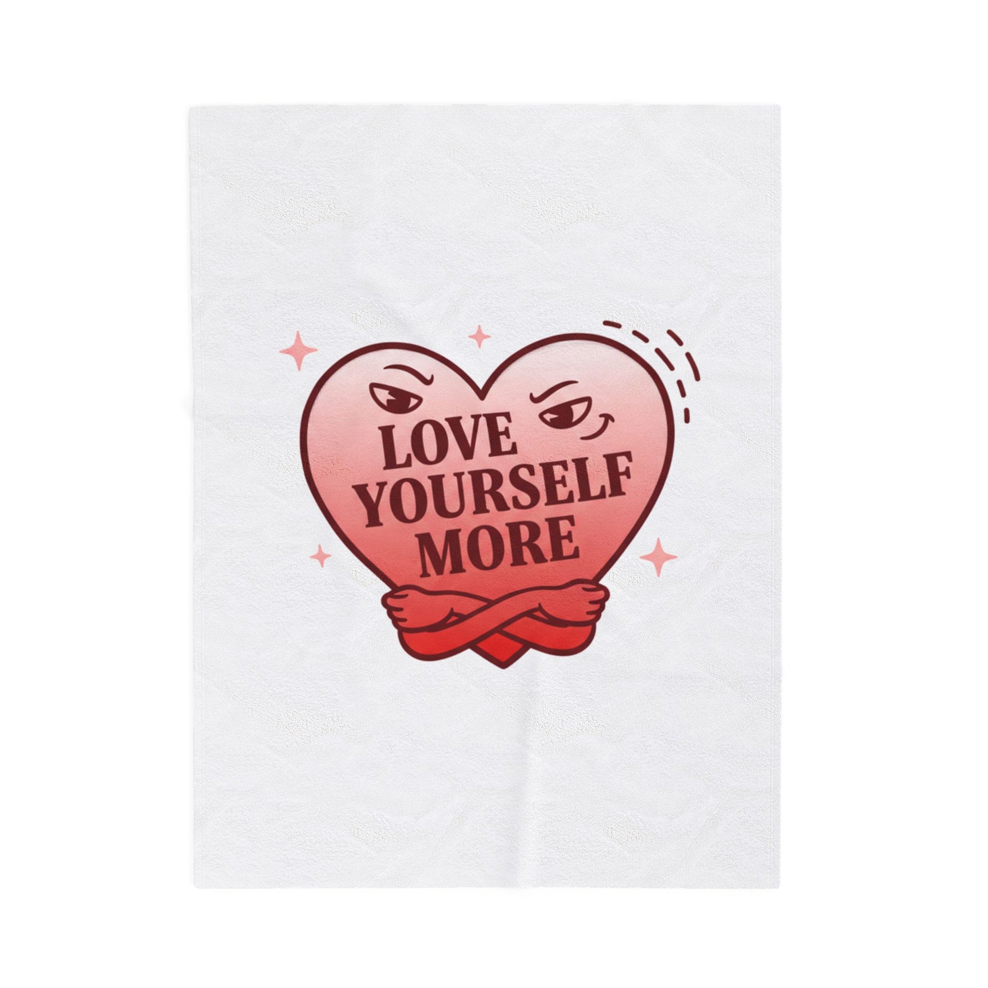 A cheeky anti‑Valentine blanket that pairs a mischievous heart motif with tongue‑in‑cheek boundary messaging. The central design shows a rosy heart with narrowed, sassy eyes and the line “LOVE YOURSELF MORE,” blending sweet pinks and red accents against a neutral background for that ‘sweet but guarded’ Hearts‑with‑a‑Twist aesthetic. Lightweight yet plush, it’s meant for cozying up while making a confident, playful statement—an accessory for readers of snarky Valentine graphics and those who favor punk‑tinged romance motifs.