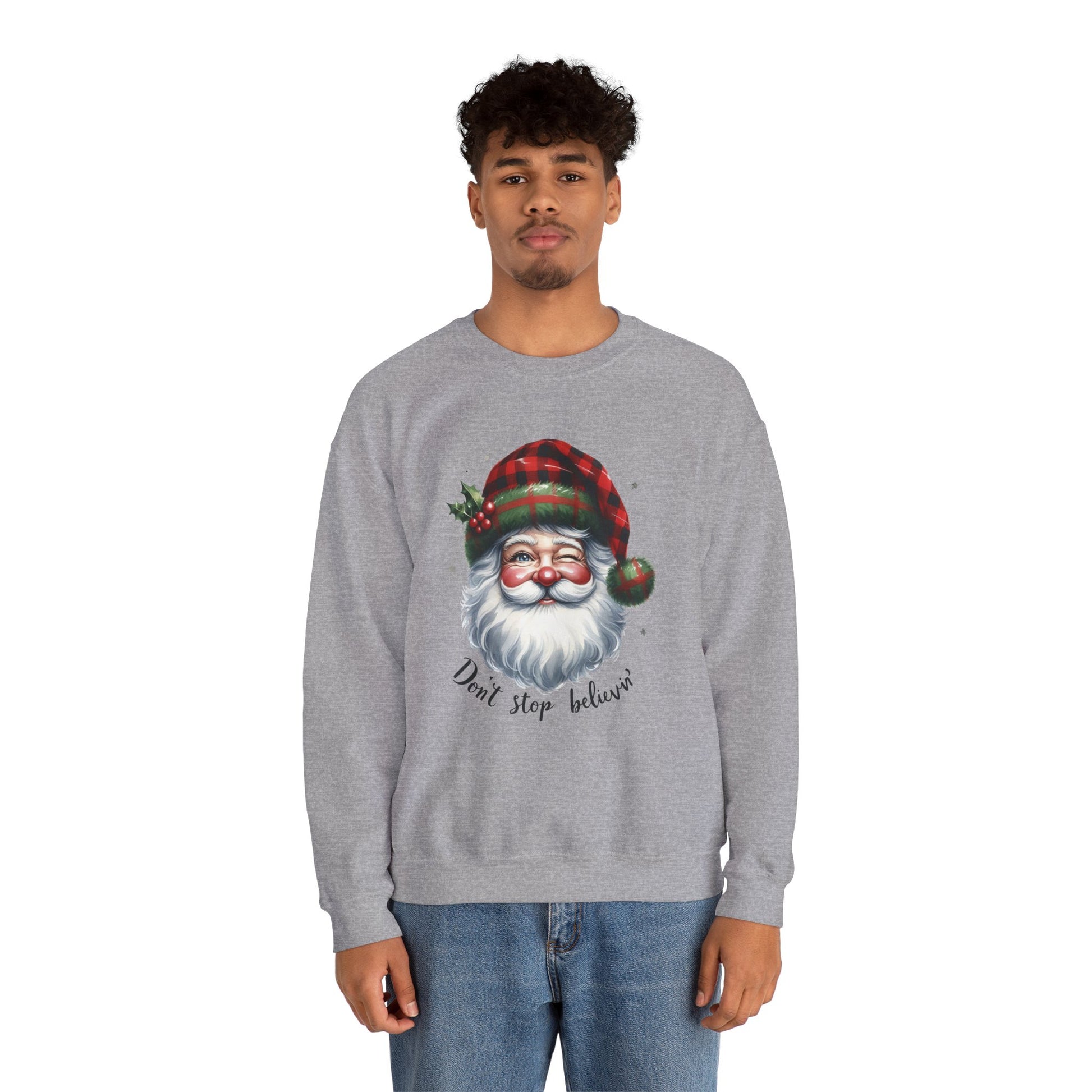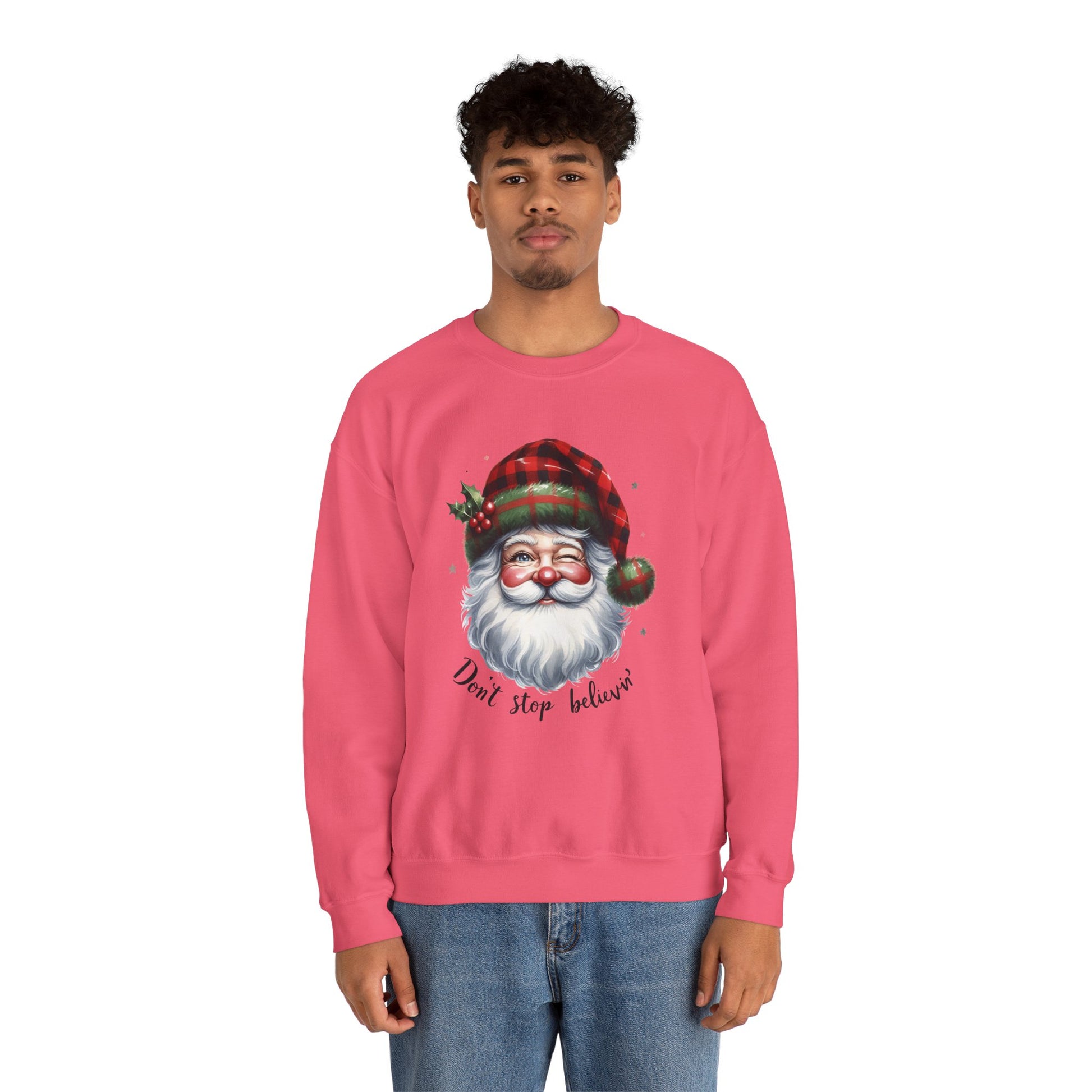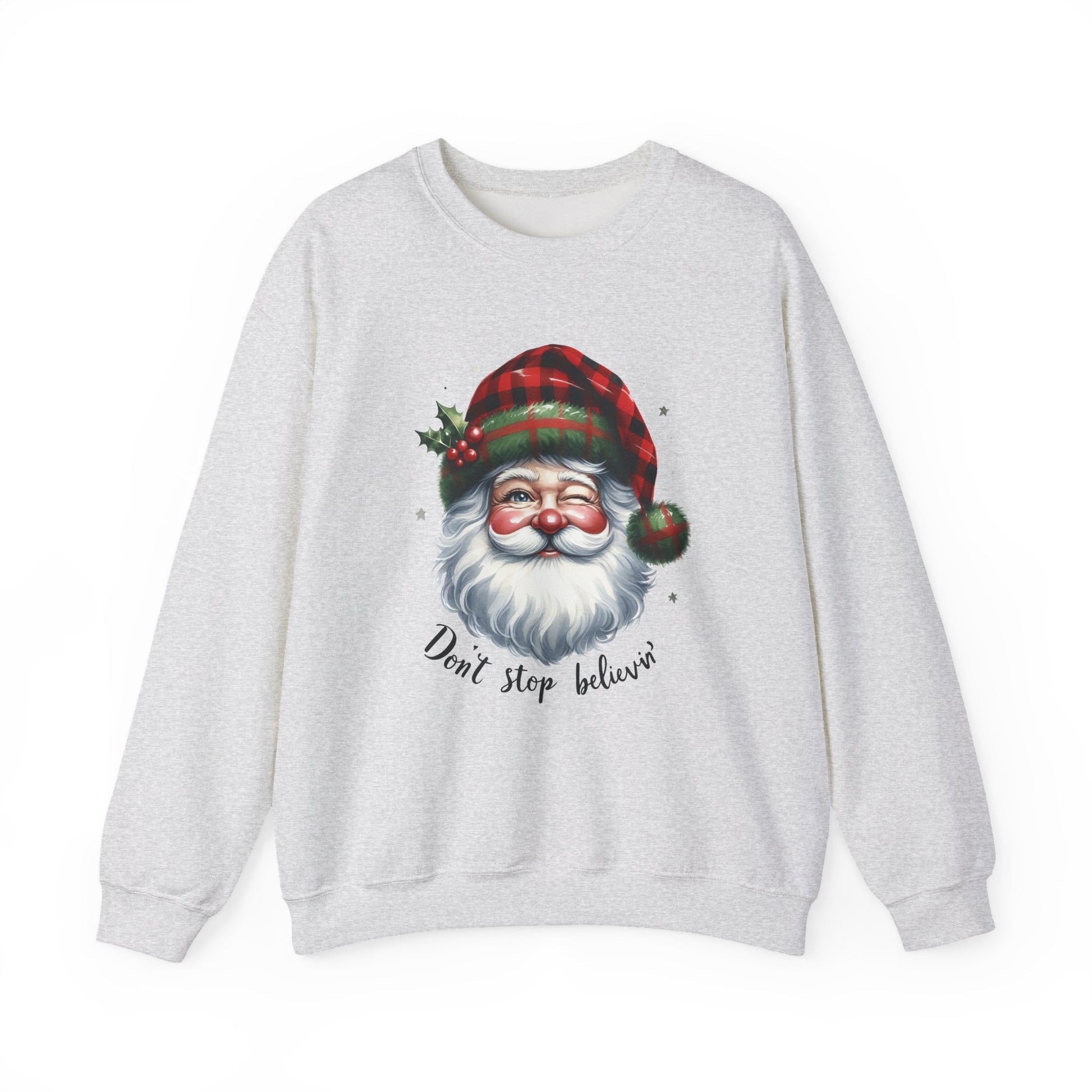Stay cozy and festive with this Don't Stop Believing Santa sweatshirt. Perfect for adults looking to add a touch of Christmas spirit to their wardrobe. This sweatshirt is ideal for holiday parties, Christmas celebrations, and cozy nights by the fire.