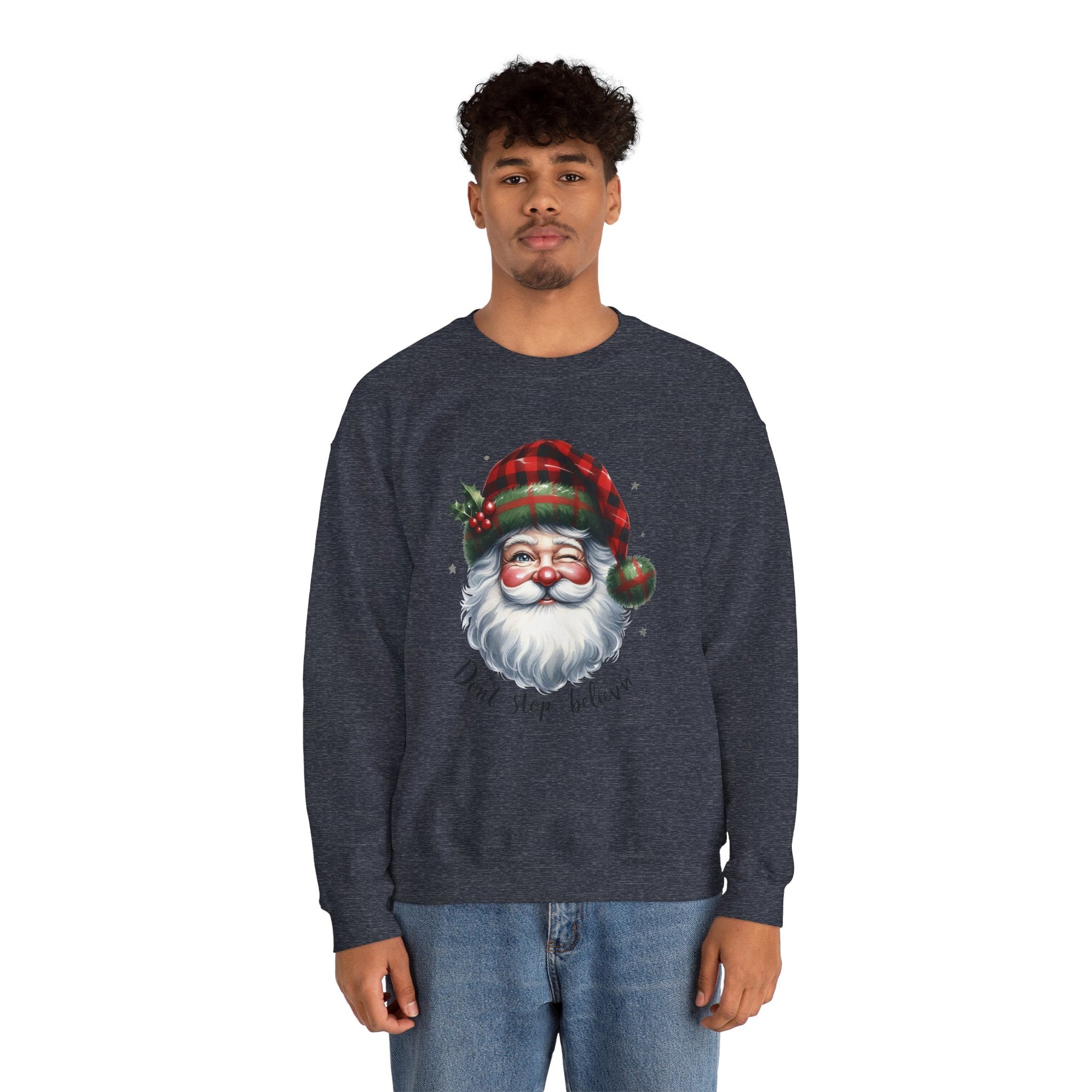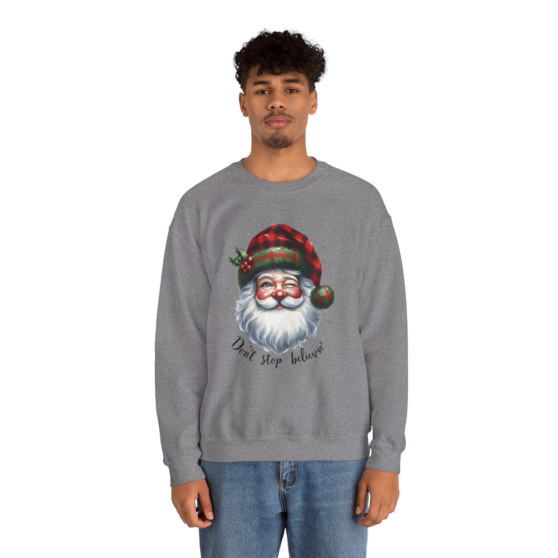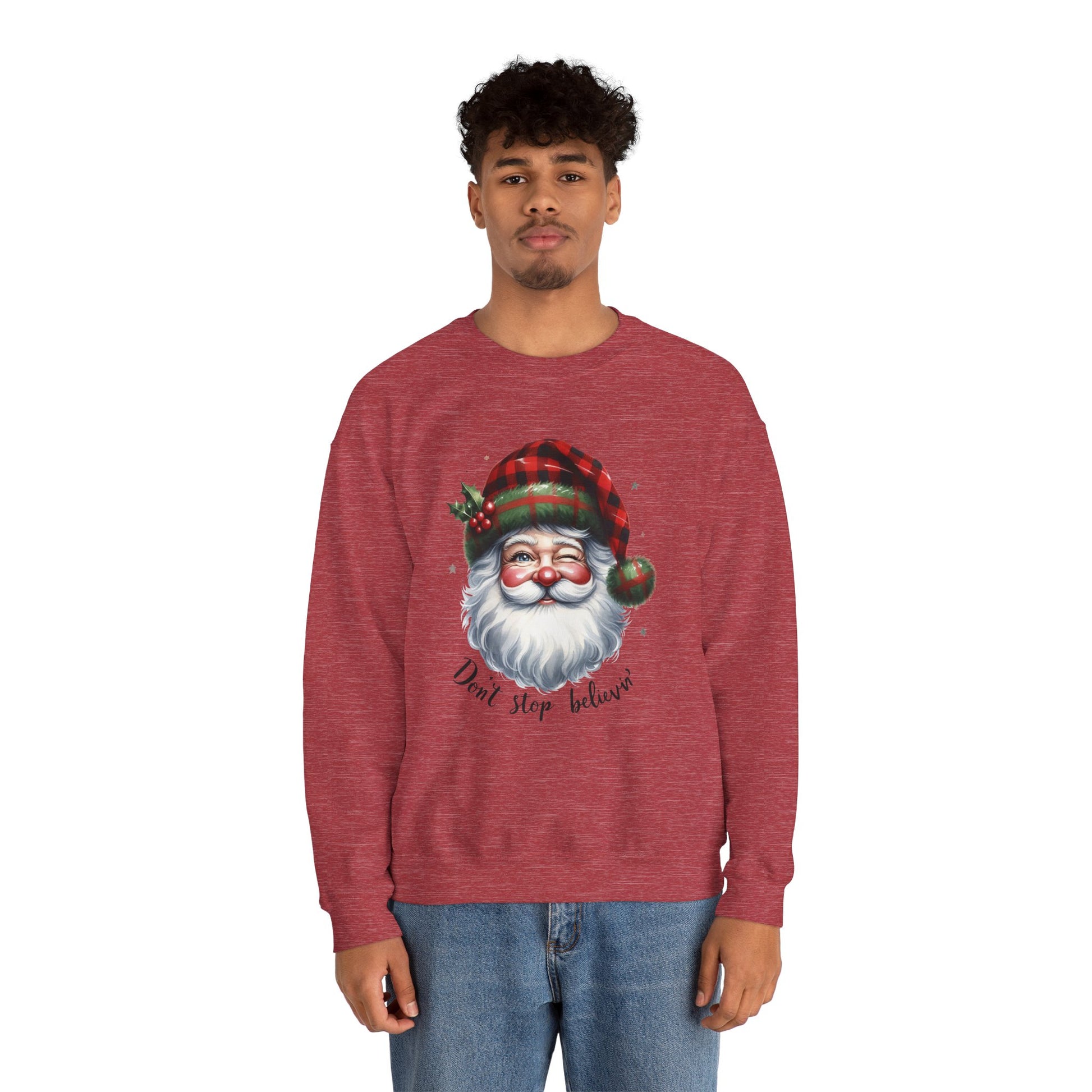 Stay cozy and festive with this Don't Stop Believing Santa sweatshirt. Perfect for adults looking to add a touch of Christmas spirit to their wardrobe. This sweatshirt is ideal for holiday parties, Christmas celebrations, and cozy nights by the fire.