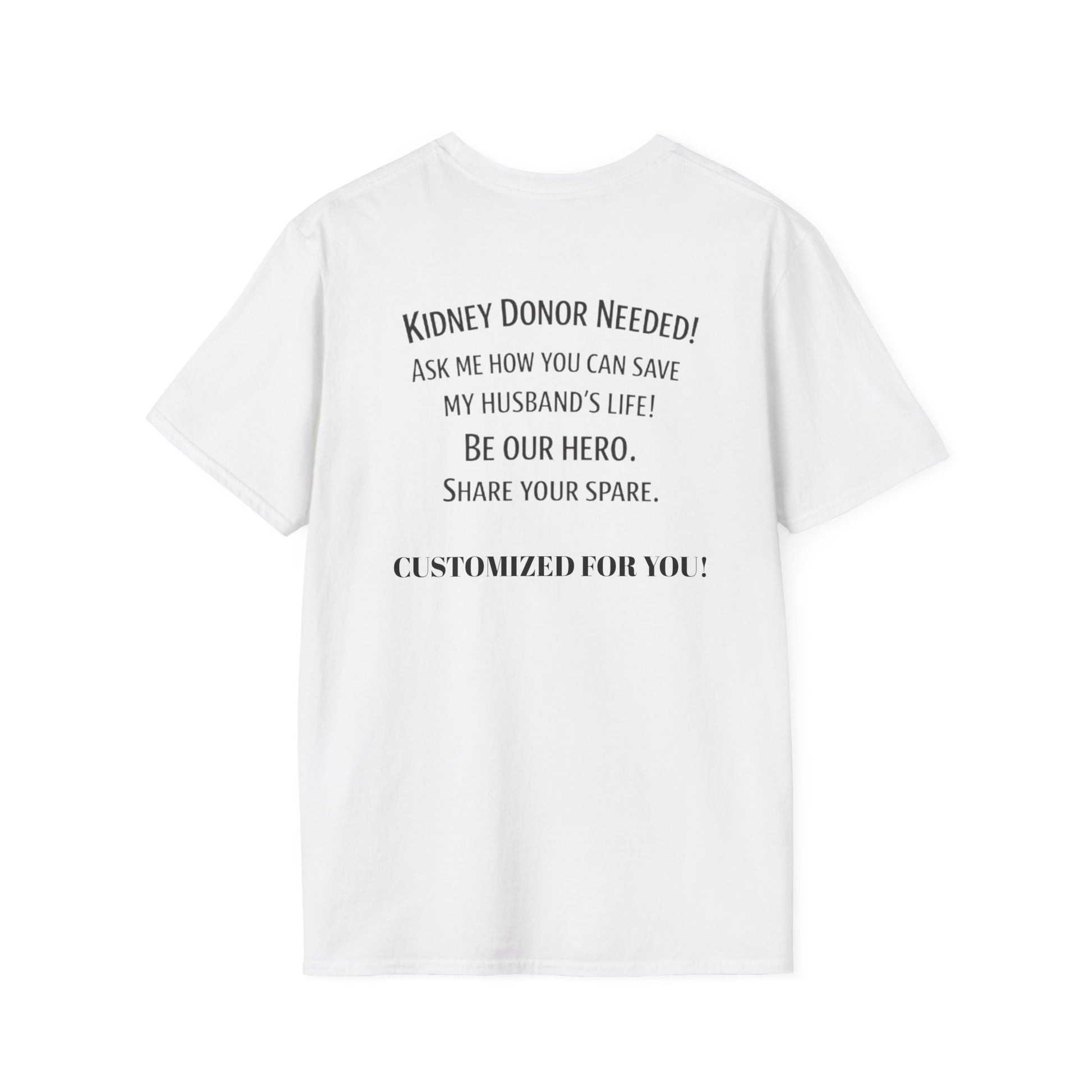 This lightweight cotton tee carries a quiet but urgent message on the back: a heartfelt appeal for a kidney donor. Wear it to walks, hospital visits, community events, or everyday outings to start conversations and connect with people who might help. The soft ring-spun cotton feels gentle against skin during long days of advocacy. Clean crew neck lines and a classic fit keep attention on the message, not the clothes. Each time you put it on, it becomes a small amplifier for a family’s hope — asking strangers to pause, ask questions, and consider giving life.