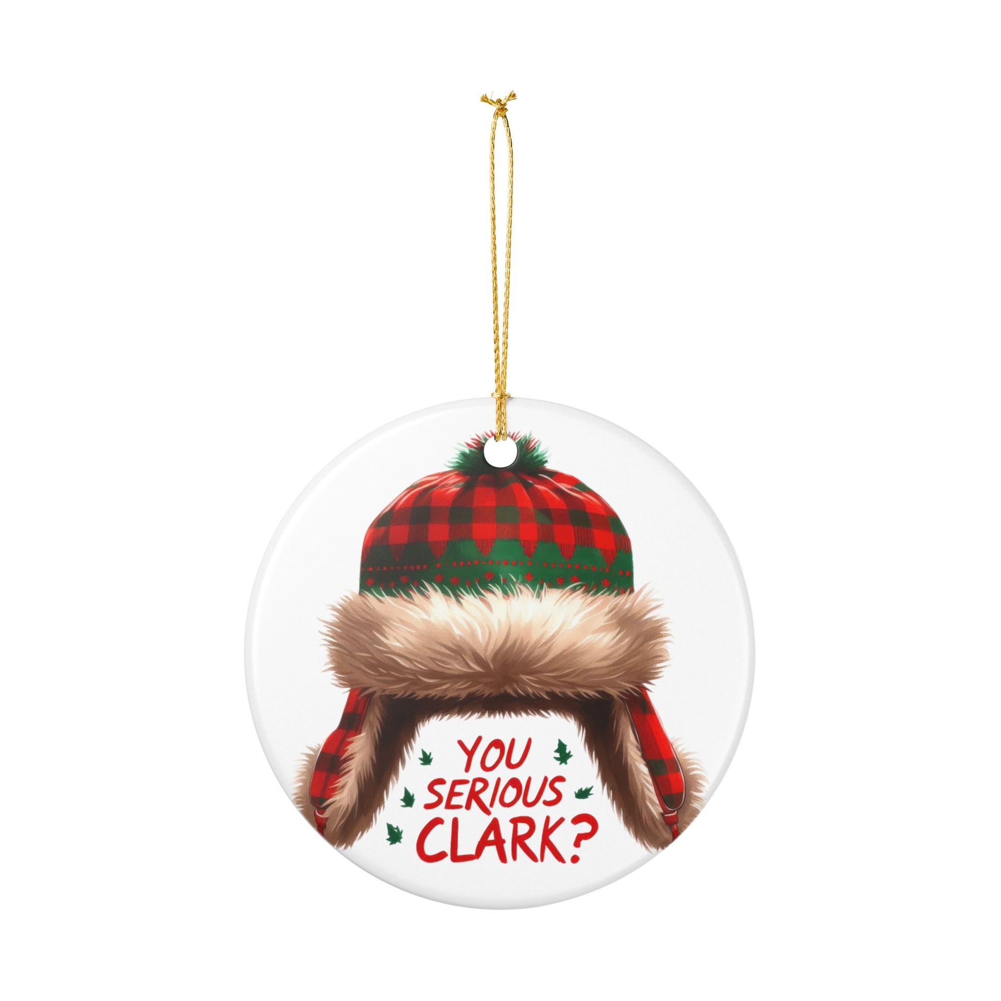 A glossy white ceramic ornament that brings playful holiday nostalgia to your tree. The round ornament features a cozy red-and-black buffalo-plaid trapper hat with faux fur trim and the cheeky phrase “You Serious Clark?” in hand-lettered red, accented by tiny holly leaves. Hung from the included gold string, this single-sided, UV-printed piece adds a warm, humorous touch to mantel displays, trees, or as a little seasonal keepsake. Each ornament is made from sturdy white ceramic with a glossy surface and matte print finish, giving the artwork a soft, tactile look against a shiny backdrop.