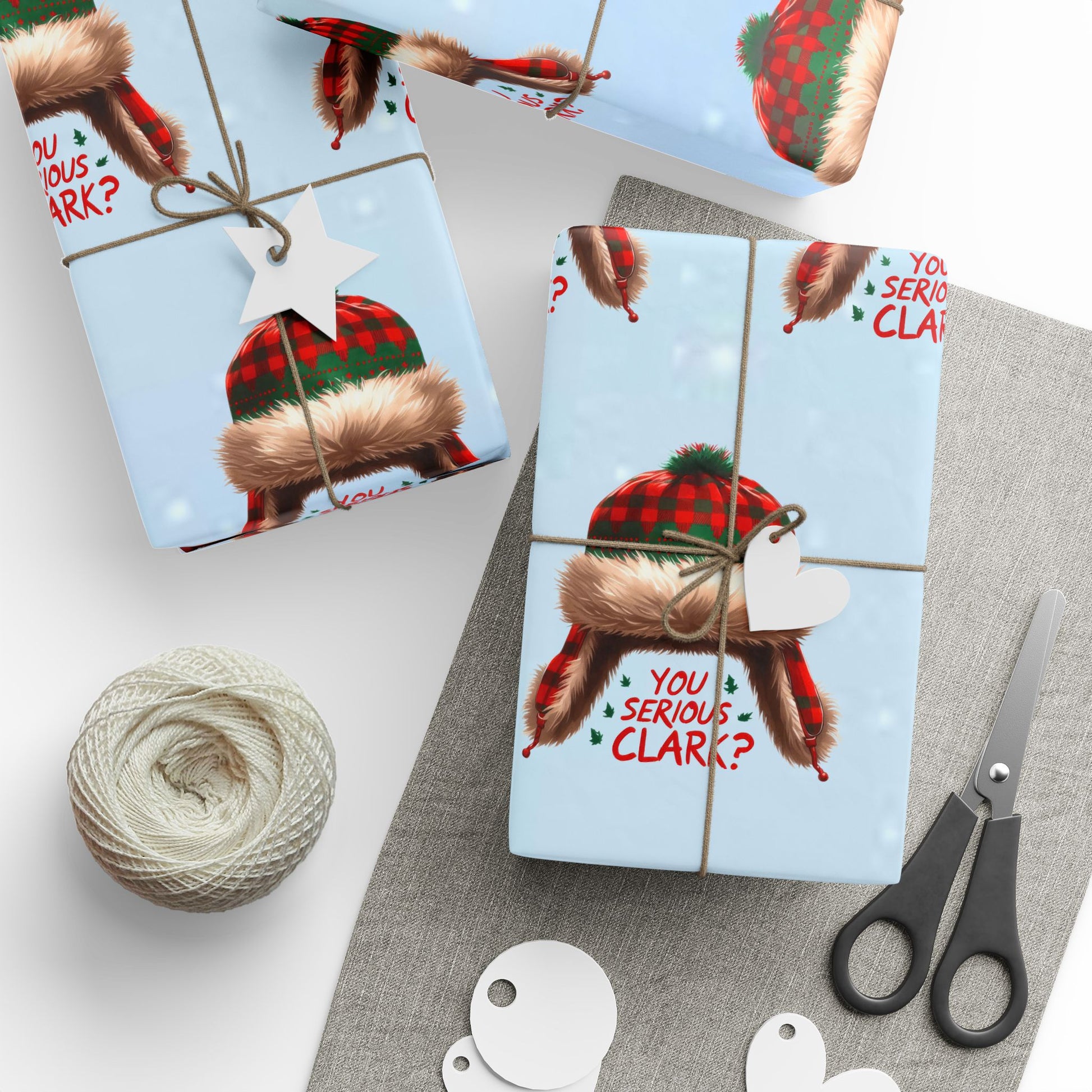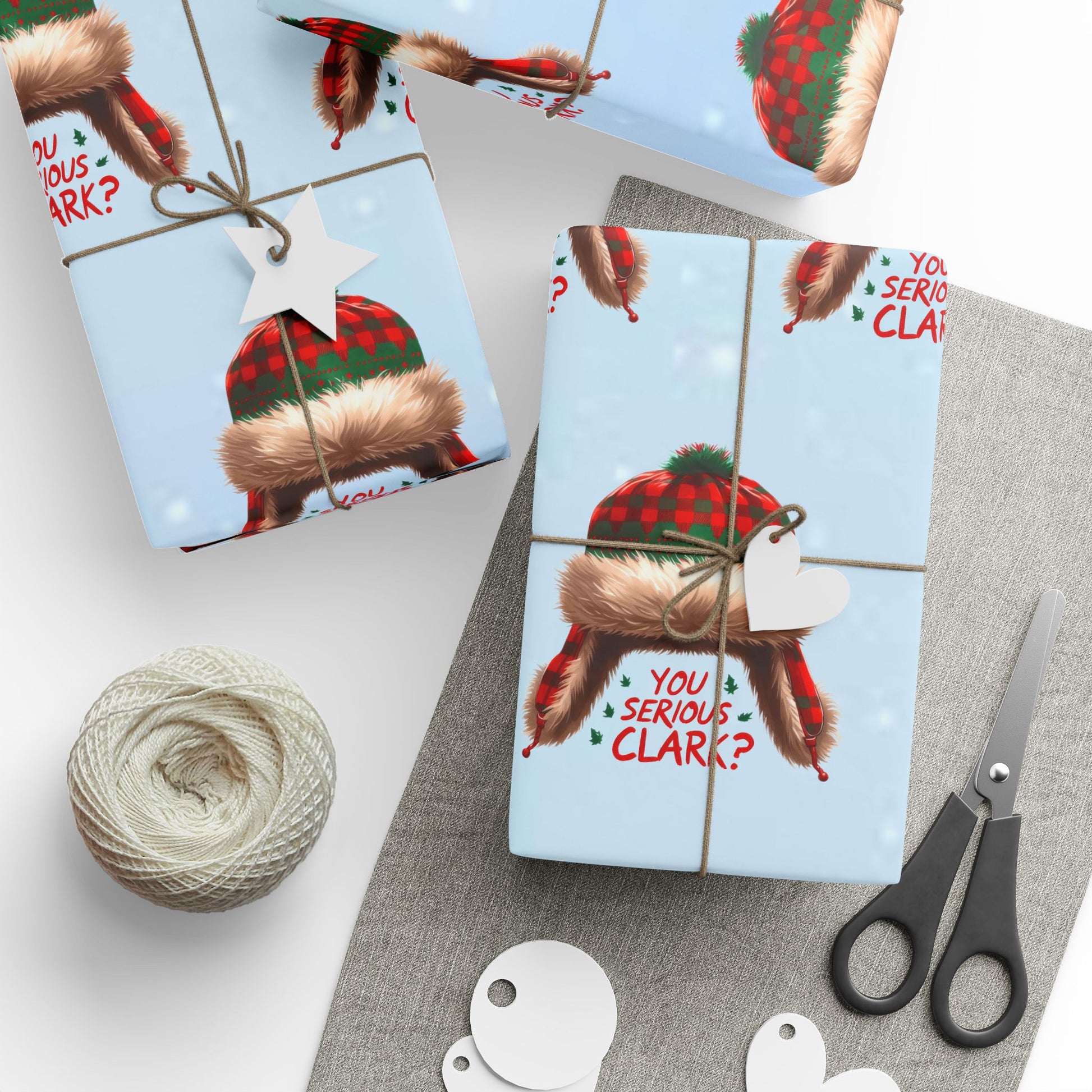 Festive and fun Christmas wrapping paper featuring the iconic 'You serious Clark' quote. Perfect for adding a touch of humor and nostalgia to your holiday gift wrapping. Ideal for those who love classic Christmas movies and enjoy incorporating quotes into their holiday decor. Relevant for Christmas, holiday gift giving, and seasonal celebrations.
